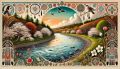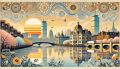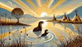 Serene Sunrise with River Otters in a Stylized Boston Landscape