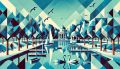 A Cubist Rendition of Boston's Public Garden in Ocean Blue Tones