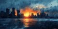 Dramatic Sunset Over Boston Skyline with Impressionistic Water Splashes