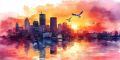 Sunset Reflections: Boston Skyline in Watercolor Splendor