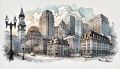 Artistic Ink and Wash Illustration of Downtown Boston's Skyline