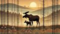 Sunrise Embrace: A Moose Mother and Calf Against a Serene Backdrop