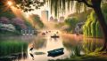 Tranquil Dawn Over Jamaica Pond with Rowboats and Blossoms