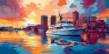 Vibrant Sunset Over Baltimore's Inner Harbor with Sleek Boat