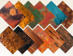 • Copper sheets. Thin sheets of copper can be laid over almost any hard surface. The designs are not printed on the copper, but created using a natural aging process that allows the manufacturer to customize the resulting patina.